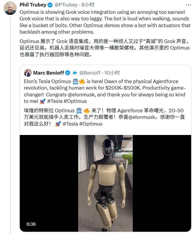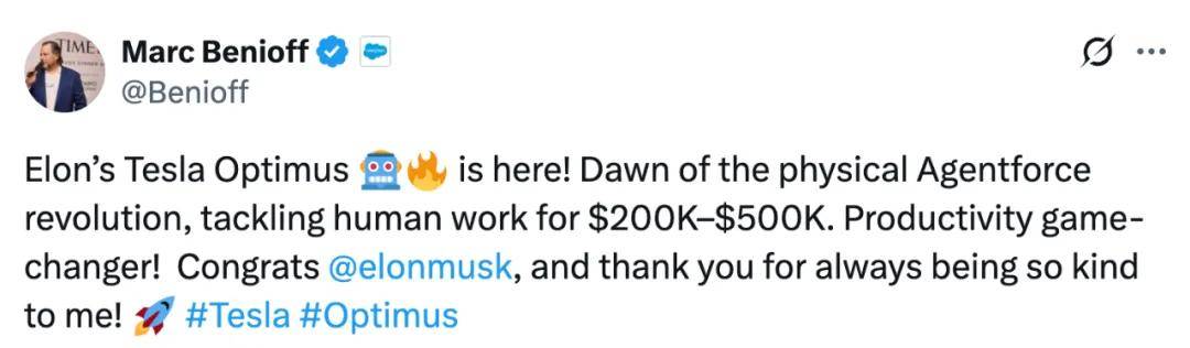 Salesforce CEO Marc Benioff 发布了一个短视频,视频中他与一个周身涂抹为金色的 Optimus 进行了一些对话,并盛赞其开启了物理智能体革命,并成为生产力变革者。价格也异常高昂,达到了 20 万到 50 万美元。他还 @了一下马斯克。
