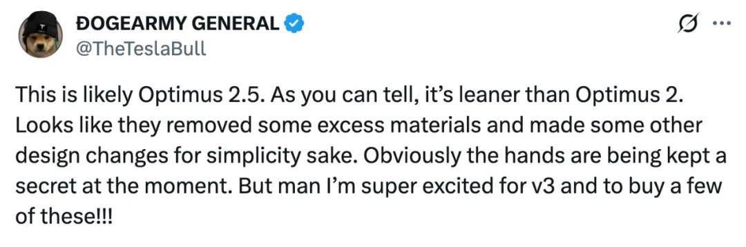有人做了大胆猜测,「这很可能是 Optimus 2.5 或 V3,它比 Optimus 2 更轻盈。看起来去掉了一些多余的部件,并在设计上做了一些简化。显然,手部的设计目前还处于保密状态。」