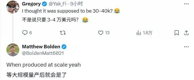 评论区很多人被 Optimus 如此高的价格震到了。根据此前的预测以及马斯克的说法,大规模量产之后博盈配资,Optimus 的售价大概为 2 万到 3 万美元。
