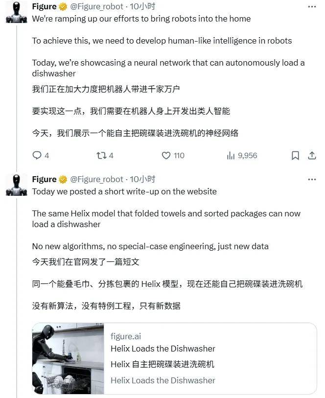 Figure 表示,他们致力于「把机器人带进千家万户」,并且强调,无论是之前的叠衣服、整理包裹,还是现在将碗碟装入洗碗机,背后都是同一个Helix 模型(Figure 的 VLA 模型)。其强大的泛化能力并非源于新算法或特殊改造,而仅仅是新数据训练的结果。