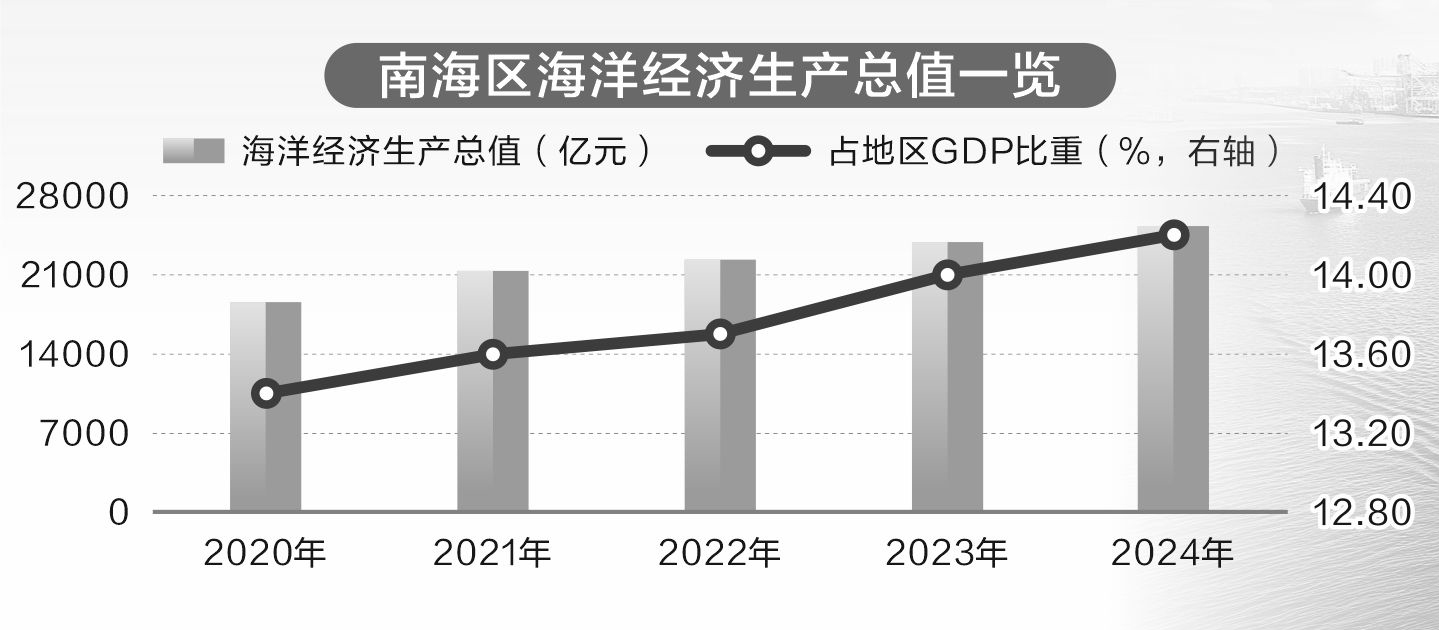 据自然资源部南海区数据,2024年南海区海洋生产总值25310.4亿元,同比增长5.9%,增速显著高于4.6%的地区经济增速。从近五年看,南海区海洋生产总值持续保持两位数增长。