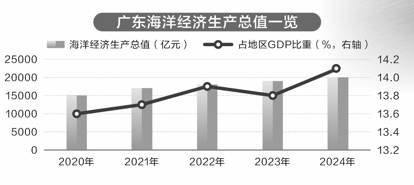 2024年,广东省海洋生产总值突破2万亿元大关,达到20022.5亿元,名义增速5.4%,占地区生产总值的14.1%,占全国海洋生产总值的19%,成为驱动地方经济高质量发展的“蓝色引擎”。