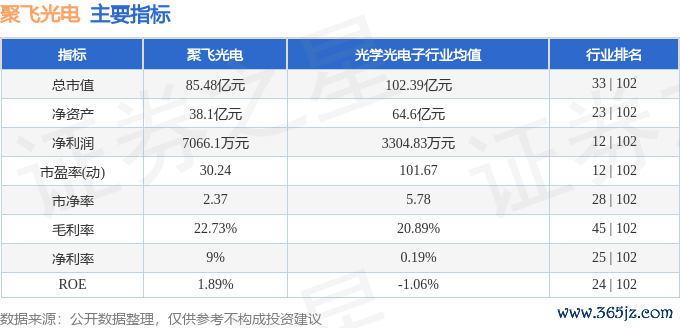 聚飞光电2025年一季报显示,公司主营收入7.79亿元,同比上升21.08%;归母净利润7066.1万元,同比下降3.2%;扣非净利润5172.59万元,同比上升10.89%;负债率37.63%,投资收益246.04万元,财务费用-540.61万元,毛利率22.73%。聚飞光电(300303)主营业务:LED封装行业。