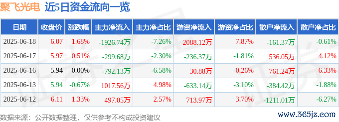 本站消息,截至2025年6月18日收盘沪深股票配资,聚飞光电(300303)报收于6.07元,上涨1.68%,换手率3.33%,成交量43.96万手,成交额2.65亿元。